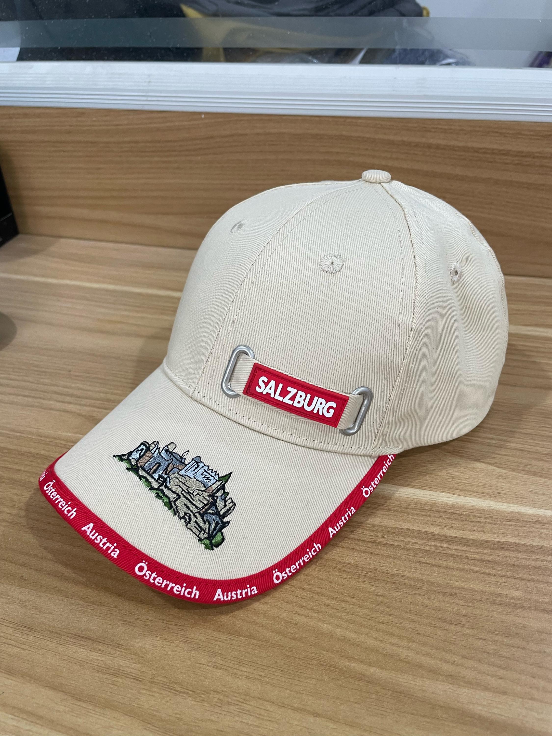 Weiterführende Links zu "Golfmütze beige-rot, PVC-Label "SALZBURG" mit Stickerei Burg, Klettverschluss"