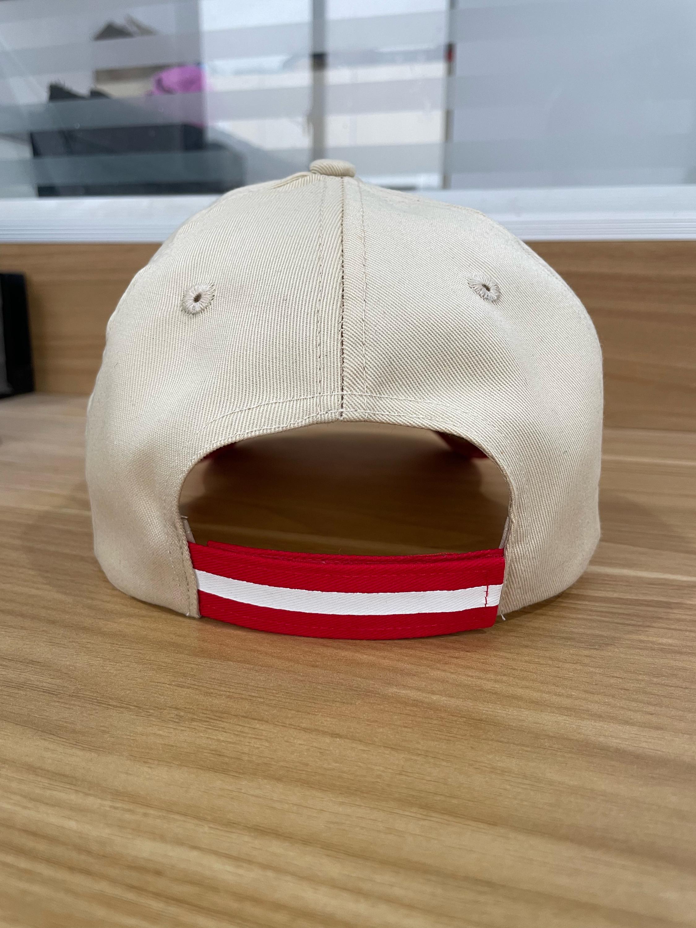 Golfmütze beige-rot, PVC-Label "SALZBURG" mit Stickerei Burg, Klettverschluss