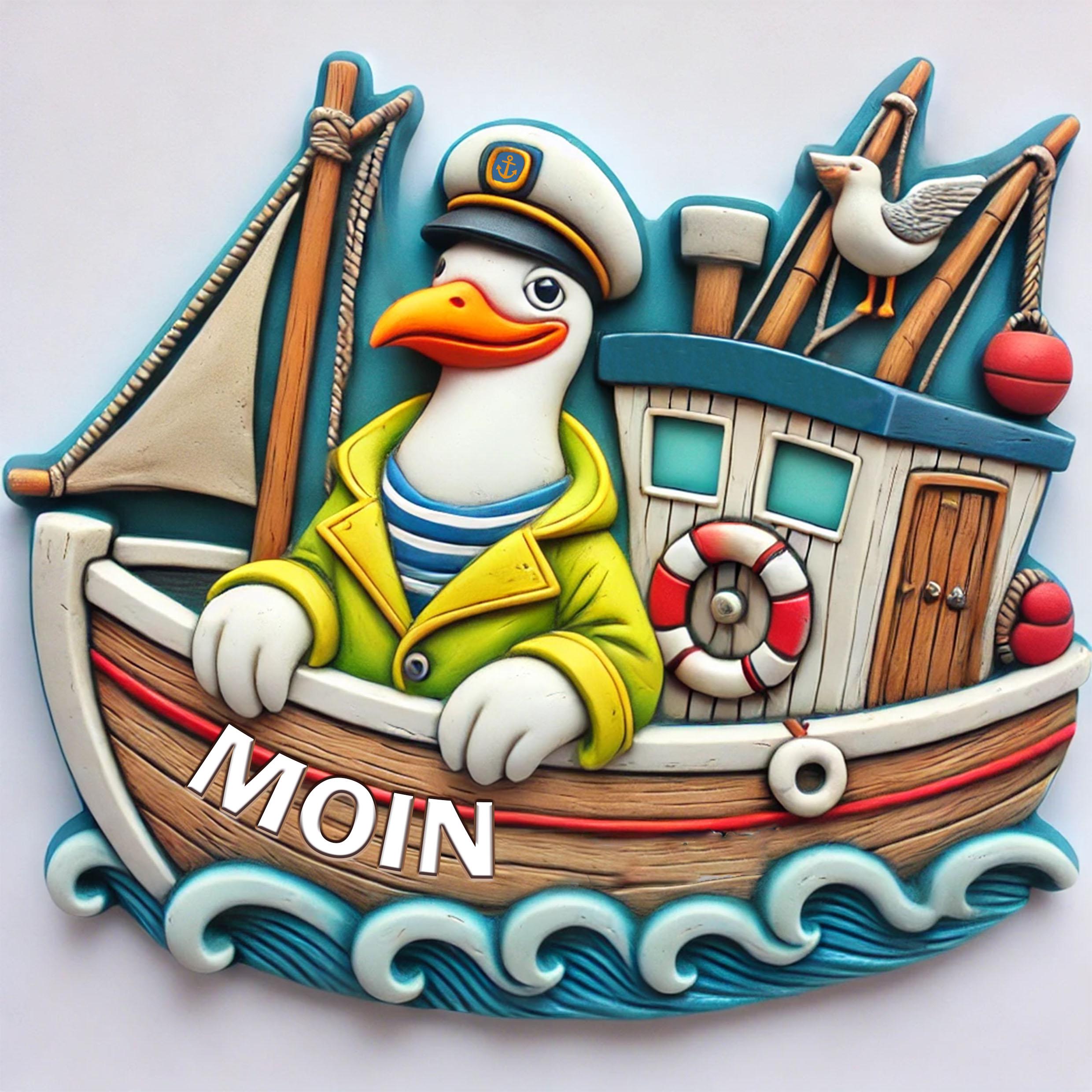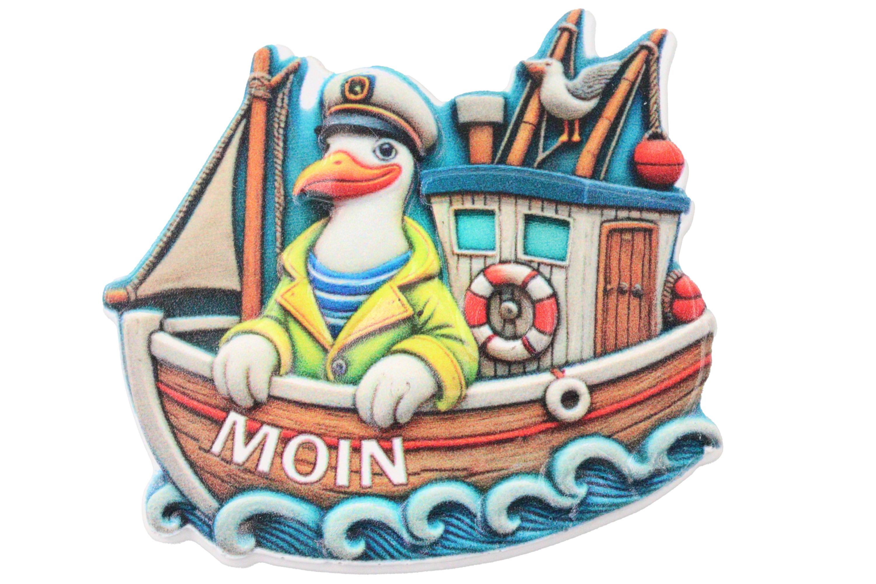 Produktinformationen "gedruckter Polymagnet "MOIN" Möwe im Fischerboot, 7.5*6.5cm"