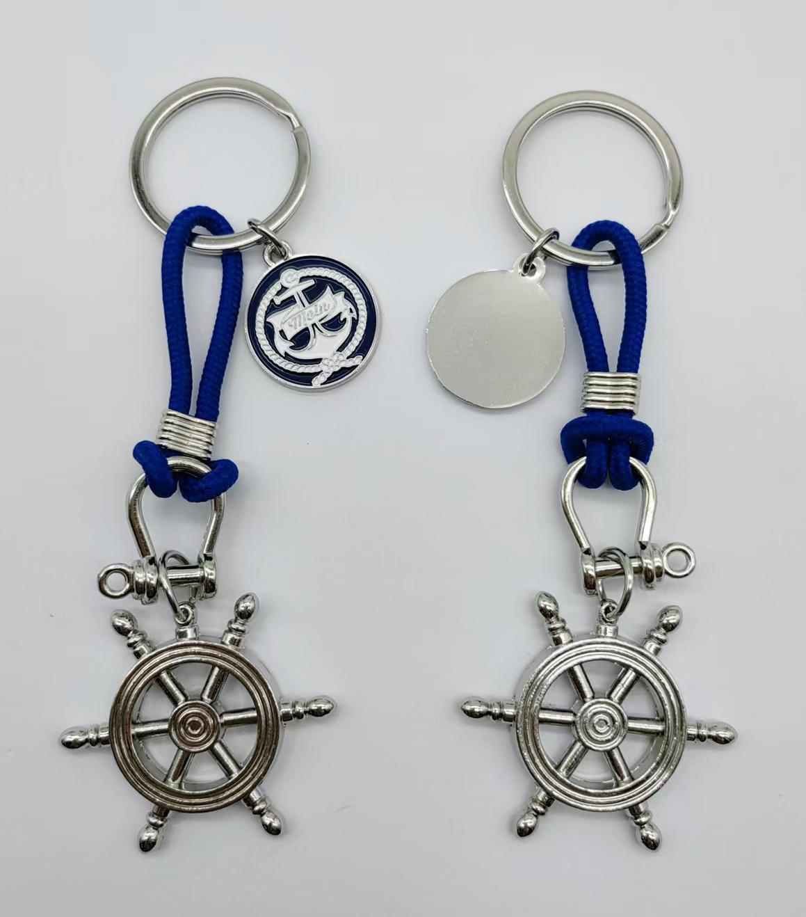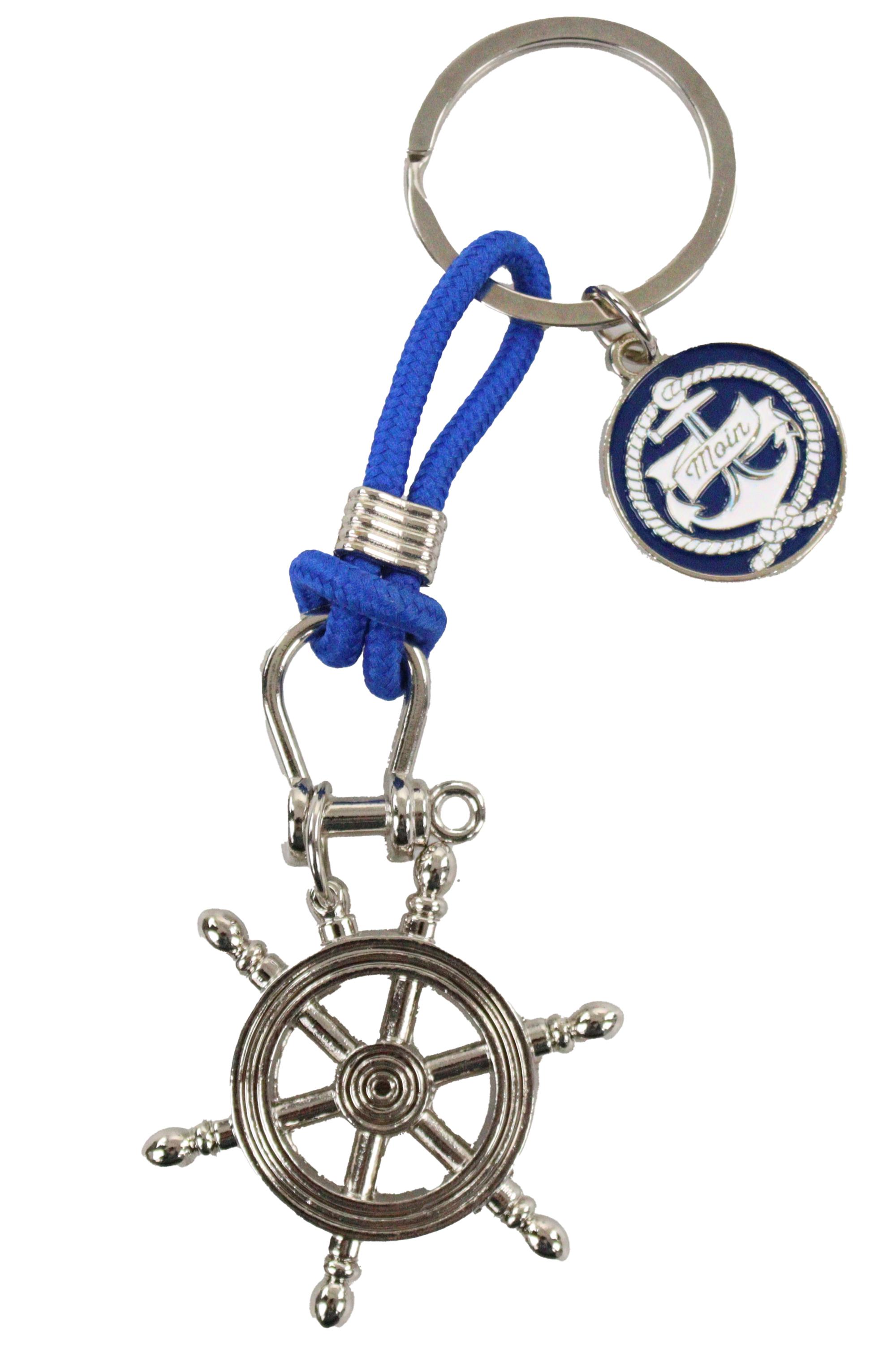 Produktinformationen "Schlüsselkette Steuerrad, blaues Seil, Metallplatte MOIN"