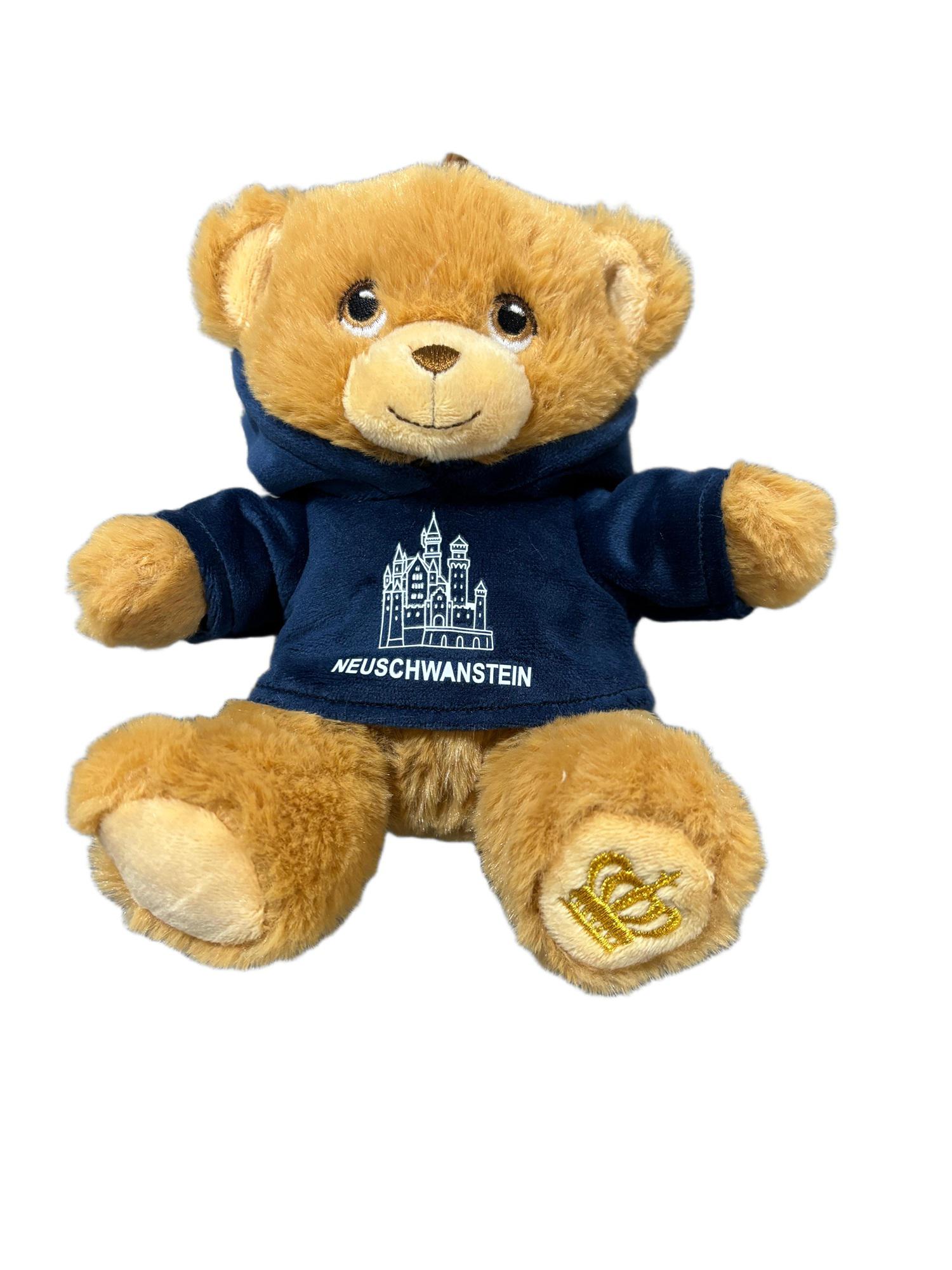 15cm Teddy "Neuschwanstein", blauer Nicki-Hoodie, Krone auf Fuß