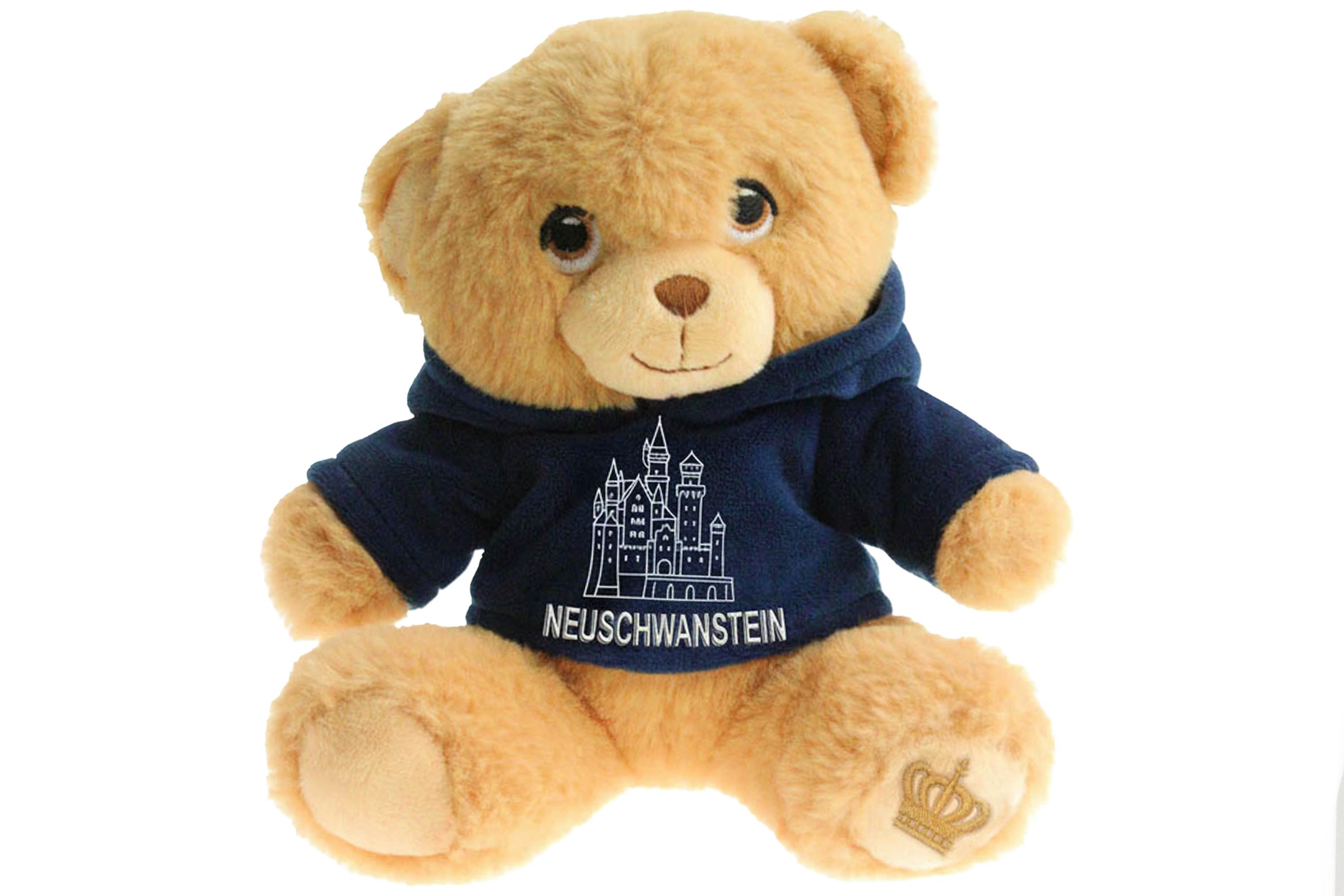 Weiterführende Links zu "15cm Teddy "Neuschwanstein", blauer Nicki-Hoodie, Krone auf Fuß"