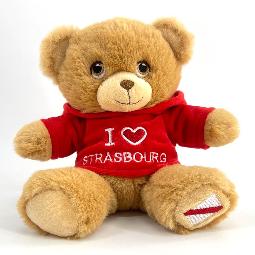 15cm Teddy "I love Strasbourg", roter Nicki-Hoodie, Elsass Wappen auf Fuß
