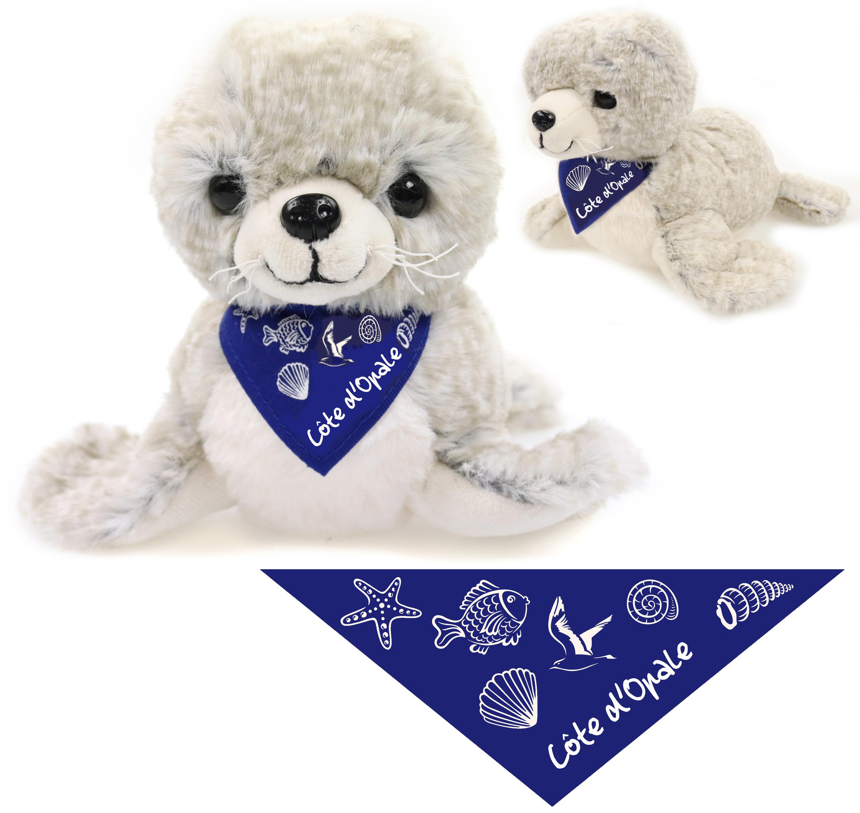 Weiterführende Links zu "30cm Plüsch Robbe, Seehund grau braun "Côte d'Opale" blauer Schal, mit Hänger"
