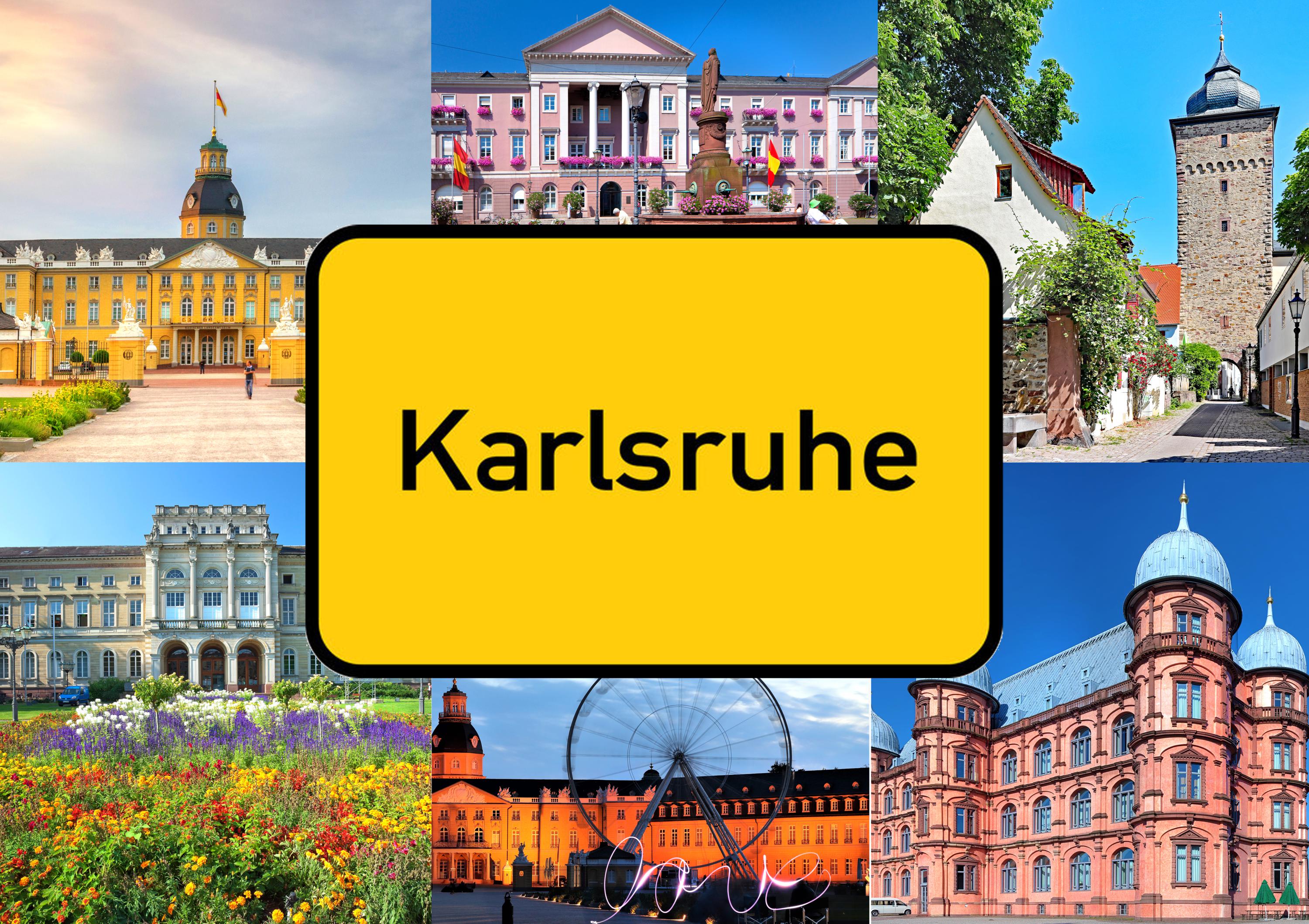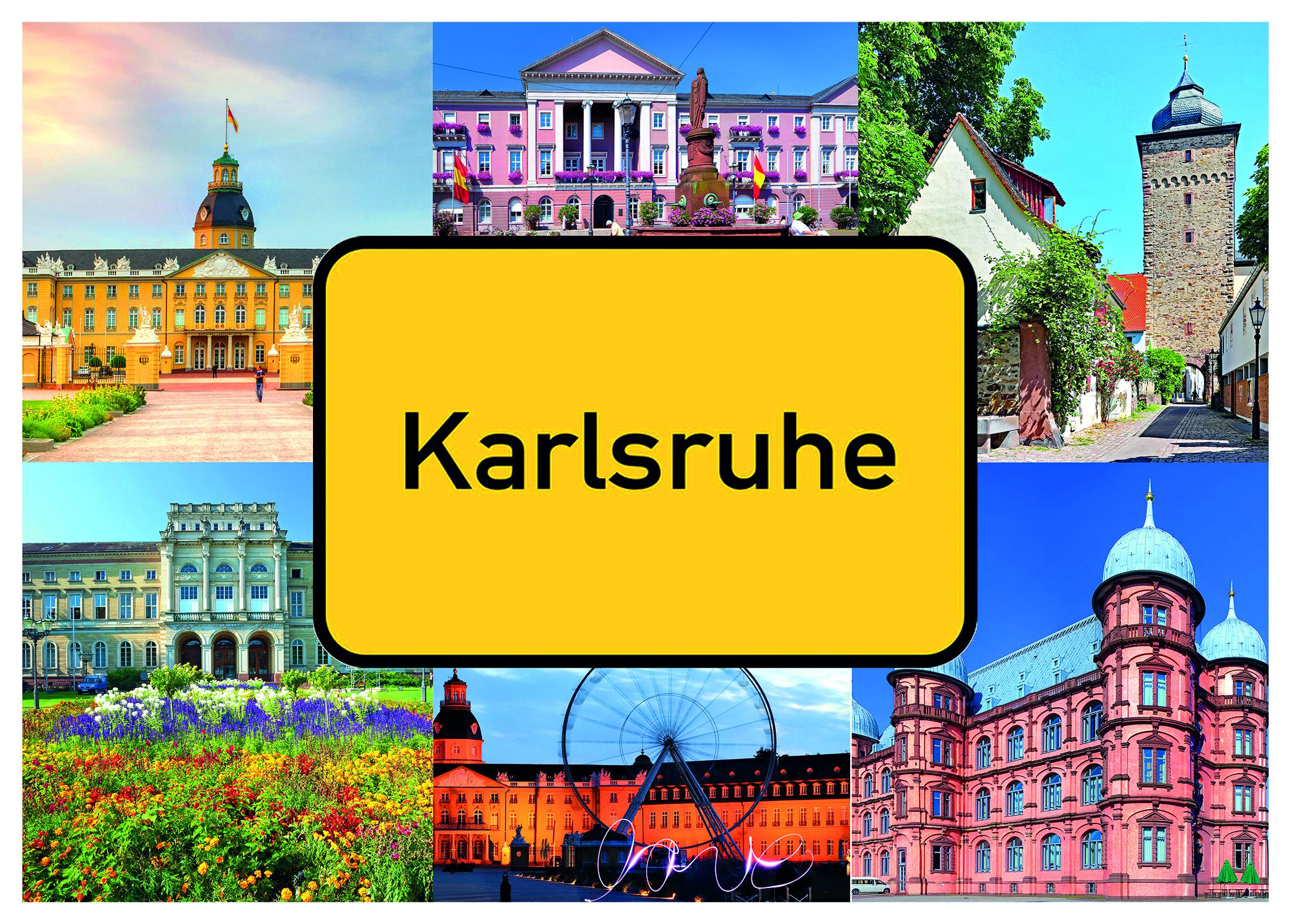 Weiterführende Links zu "Große Postkarte "Karlsruhe" Ortsschild, Riesenrad, Schlösser 17,5x12cm"