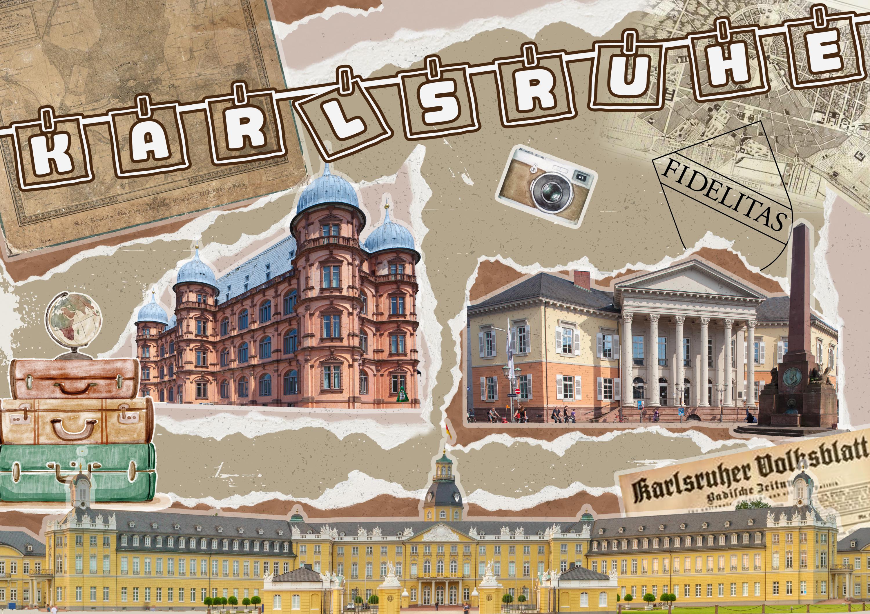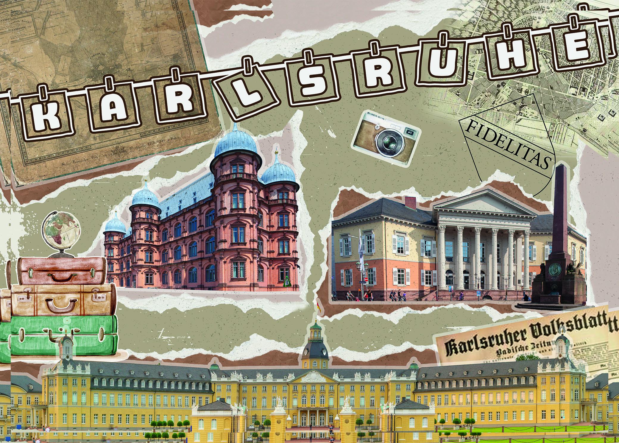 Weiterführende Links zu "Große Postkarte "Karlsruhe" Journal, Koffer,Zeitung, Gottesaue,Schloss 17,5x12cm"