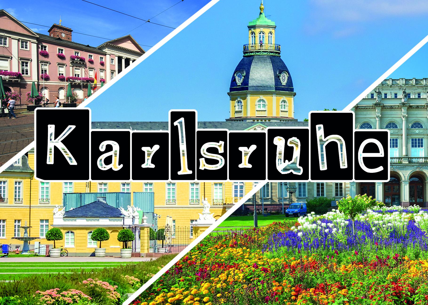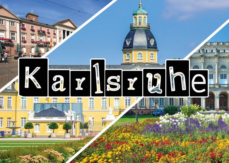 Weiterführende Links zu "Postkarte A6 "Karlsruhe" Collage Schloss, schwarze Buchstaben 148*104mm"