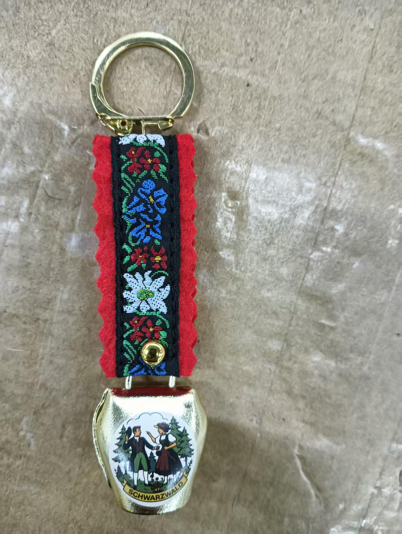 Weiterführende Links zu "K400005 Schlüsselkette 3.3cm Glocke gold "Schwarzwald" mit Bortenband Alpenbl."