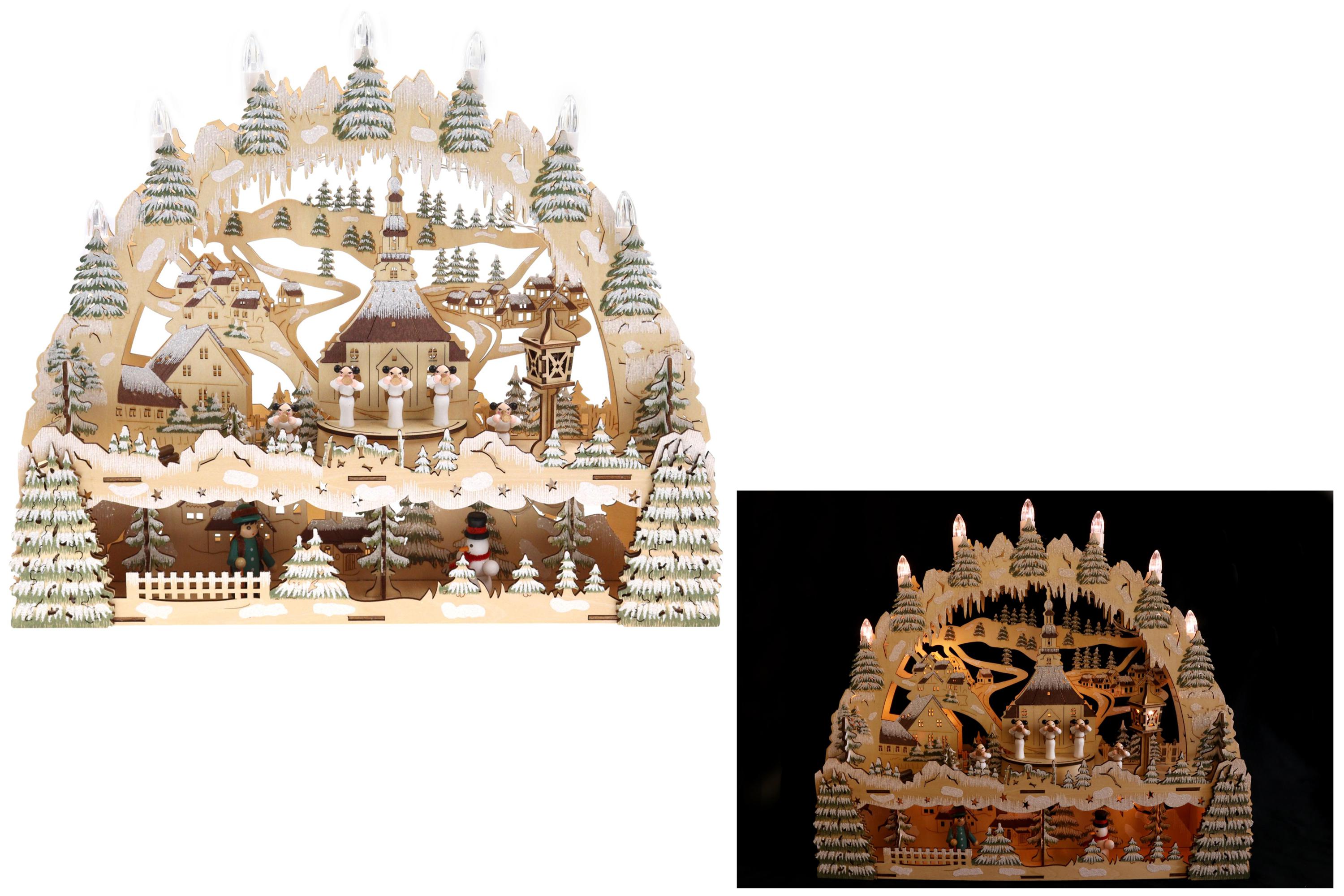 Produktinformationen "Holzschnitt Lichterbogen, Dorf mit Kirche, Glitzer, 44,5*9,5*38cm"
