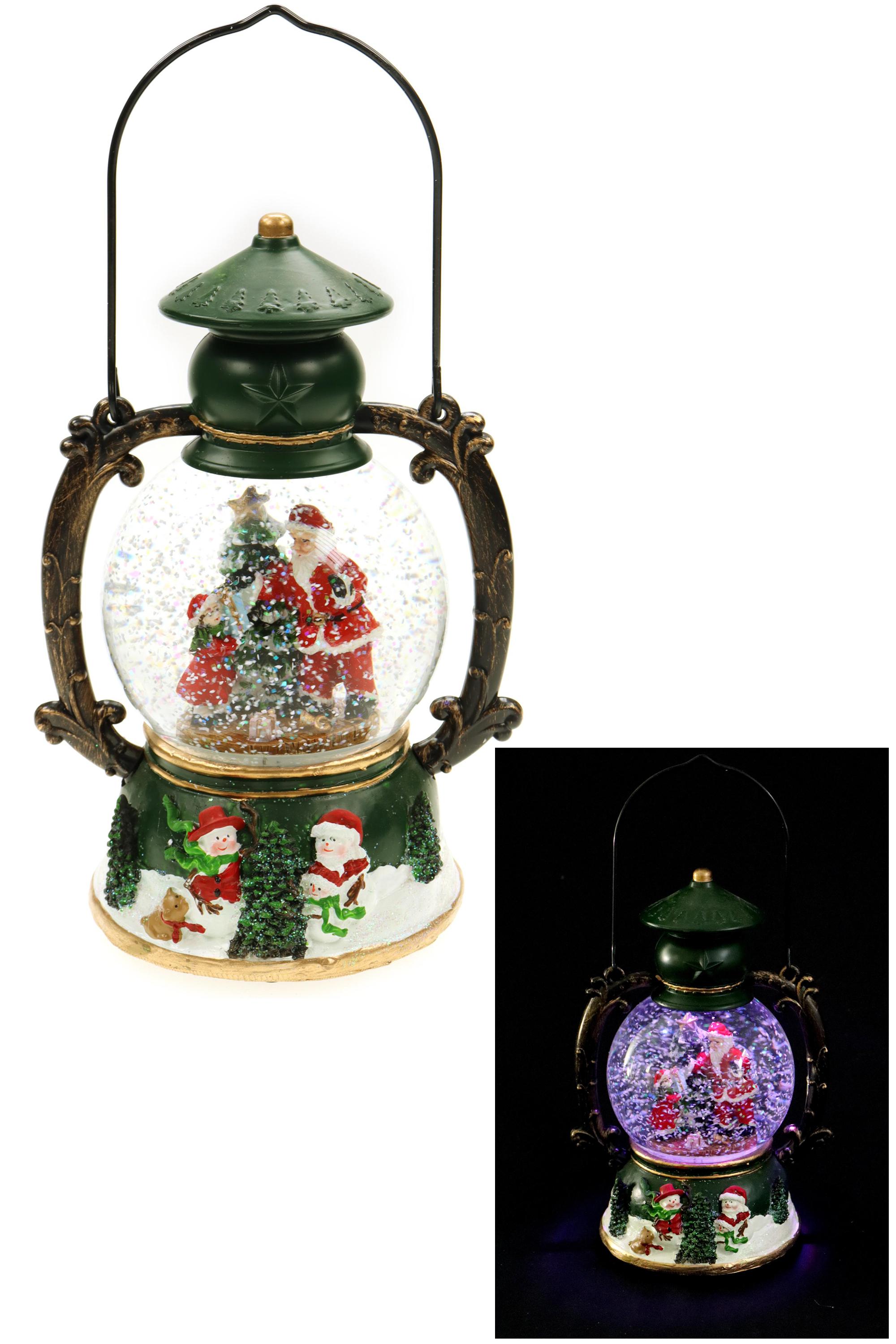 Schneekugel/Spieluhr 100mm, grüne Laterne, Licht, Glitzer, Schneeantrieb, 21cm